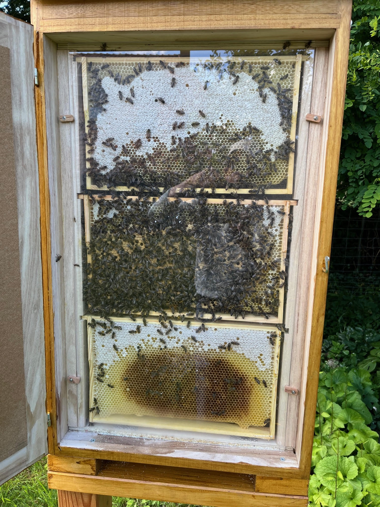 In unserem Schaukasten lebt ein kleines Bienenvolk mit Königin unter natürlichen Bedingungen. Aus der Nähe lässt sich das vielfältige Treiben in einem Bienenvolk beobachten, z.B. Bienentänze, der Schlupf junger Bienen oder das Füttern junger Bienenlarven. Wer sich Schaukasten und Bienenstand näher ansehen möchte, kann sich gerne unter der Handynummer 0172 8260188 anmelden.